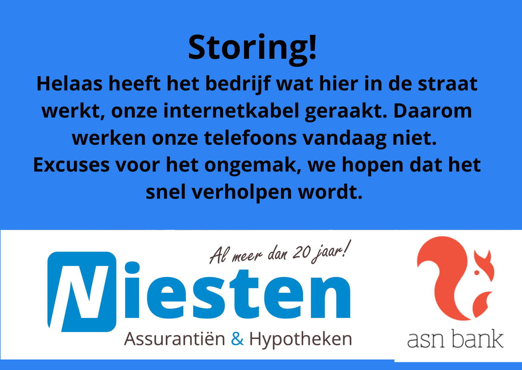 We vragen iedereen om ons een mail te sturen via info@niesten.nu, zodat we via de mail antwoord kunnen geven op jouw vraag. Excuses voor het ongemak.